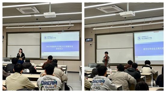 辅导员秦怡老师从学生管理的角度出发,提醒同学们合理安排时间,主动与导师沟通,保持良好的学习状态,确保论文写作与日常学习、实习就业之间的平衡。教务卢琦老师详细介绍了2026届毕业论文(设计)的整体工作安排,明确了各时间节点的工作内容与提交要求及相关注意事项。优秀毕业生代表娄同学结合自身撰写毕业论文的经历,从选题、数据处理、写作技巧到答辩准备,分享了实用建议与心得体会,为学弟学妹们提供了宝贵的一手参考。