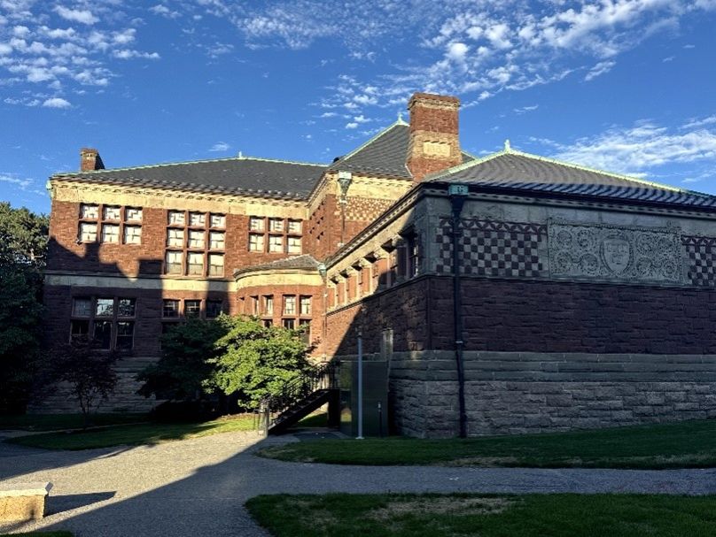 哈佛大学在查尔斯河附近,不同于MIT的现代摩登,古老宏伟的建筑群展示着哈佛大学的历史和传承。大部分暑期学校的课程教室都安排在Harvard Yard,它是哈佛大学的主校区。这里,楼房高矮胖瘦,斑驳的红砖墙和暗沉的大理石相衬,几条碎石小径划分出通往各处的要道,大片泛着光的草坪变成拼图散落各处,镌刻着“真理”(veritas)的徽章随处可见,游客行人络绎不绝。庄严肃穆的背景,藏不住氤氲着的蓬勃生机与活力。
